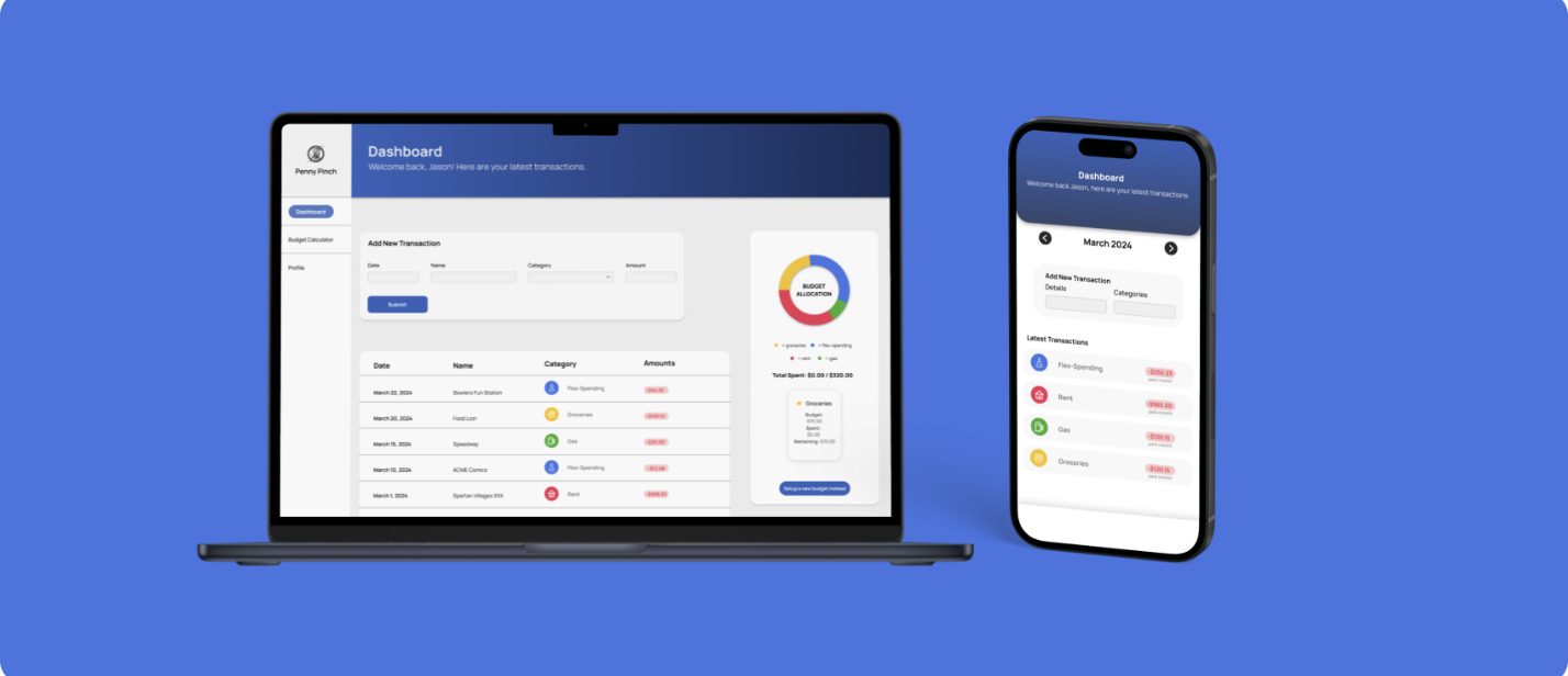 Penny Pinch is a financial web platform designed for college students to budget with ease. As a group of four college students ourselves, it was important for us to focus on something that could lessen the burden of balancing personal finances, keeping up with schoolwork, and handling the pressure of work all at once. As students, we know how important it is to have technologies that are designed to make people's lives easier.